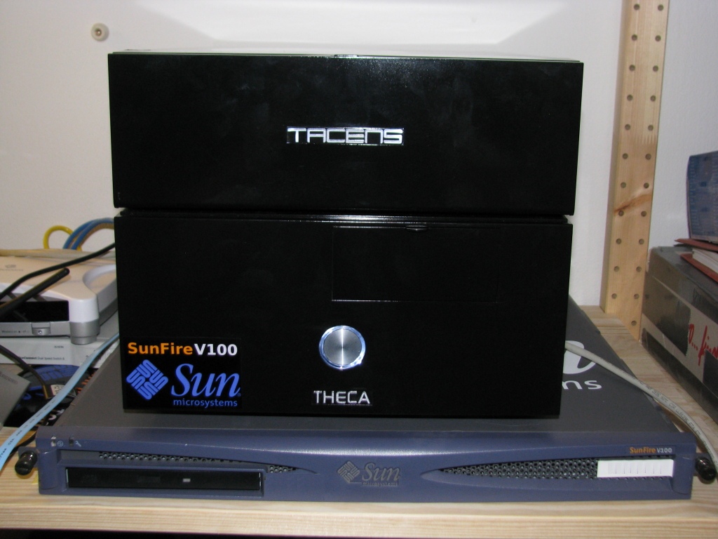 Why? Well, so I found myself the happy owner of a SunFire V100, a nice little UltraSPARC machine. NetBSD runs great on it. Only one drawback: in the original configuration (the 1 HE pizzabox) the damn thing is noisy as hell - the standard problem of this form factor.
